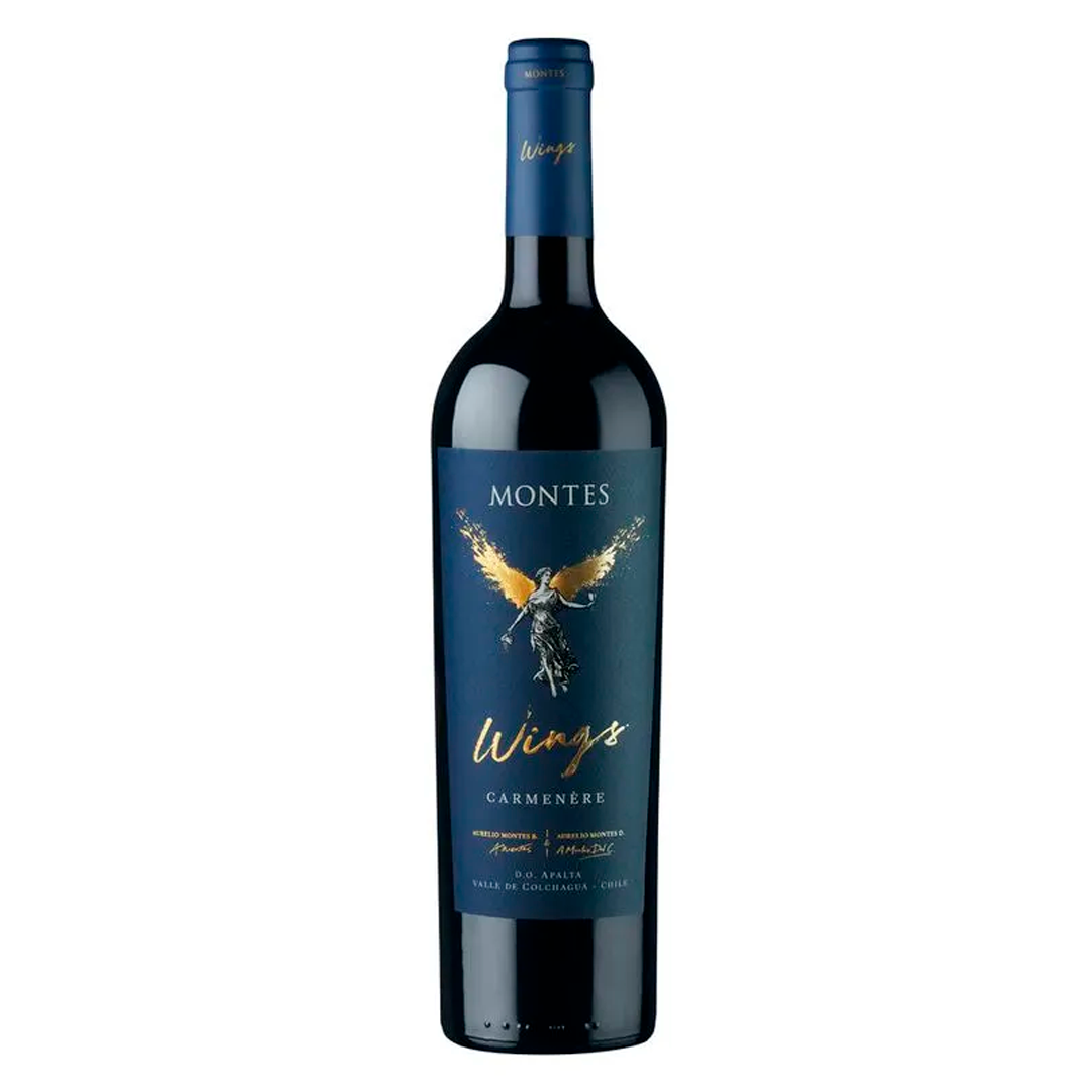 Vino Montes Wings Carmenere 2020 750ml – Carmenere premium de autor, intenso y elegante, con fruta negra, especias y crianza en roble francés.